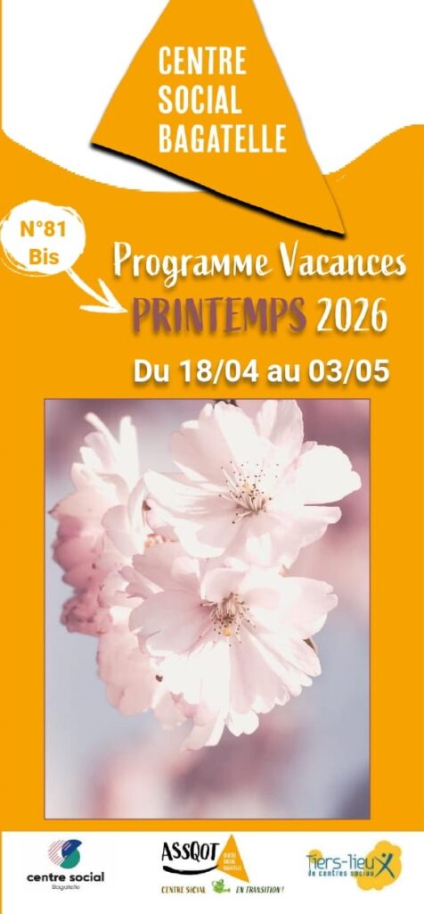 Nous avons le plaisir de vous partager le programme des vacances de printemps, du samedi 18 avril au dimanche 03 mai. Durant cette période, le centre social de Bagatelle passera en horaires vacances. Notez que le centre sera fermé le vendredi 01 mai, jour férié.